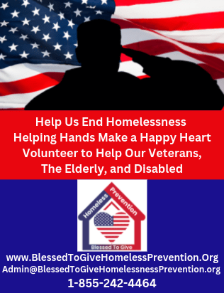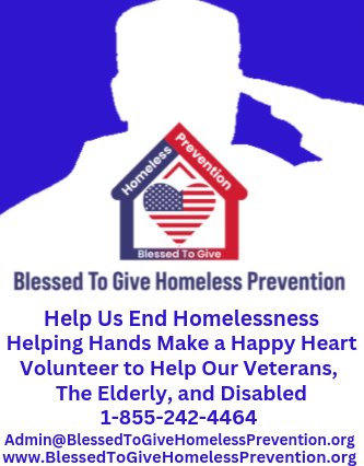Blessed To Give is a nonprofit organization currently filed in the state of Texas; but with the intent of providing services nationwide. The objective of Blessed to Give is to prevent homelessness, primarily among our veterans, the elderly and those disabled who are more and more becoming displaced due to the cost of living that has now inflated beyond their fixed incomes.